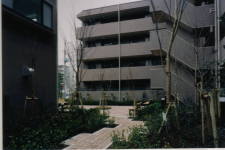 外壁仕上げは45二丁タイル貼 屋根は露出シート防水 中庭床はインターロッキングタイル貼